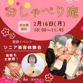 プラっとざま初!『シニア美容体験』開催決定! 毎月開催されているおしゃべり庵の冒頭イベントにて 美容についてのお話とレクチャー、ご希望の方にはハンドケ…